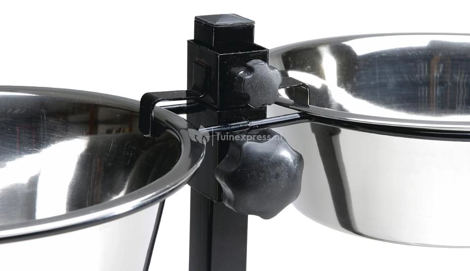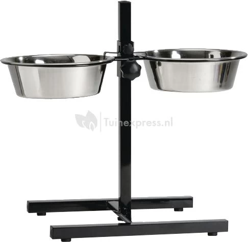 Hondenstandaard inclusief 2 RVS bakken. De standaard is in hoogte verstelbaar en aan de onderzijde voorzien van rubberen doppen tegen bescherming van uw vloer. Doorsnede van de RVS bakken zijn 20, 25 en 28 cm. Kleur: zwart.