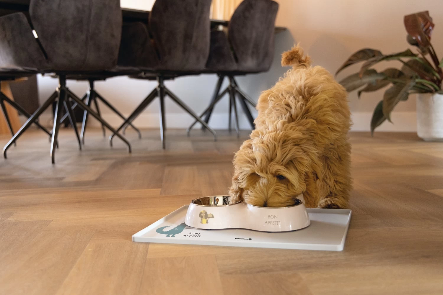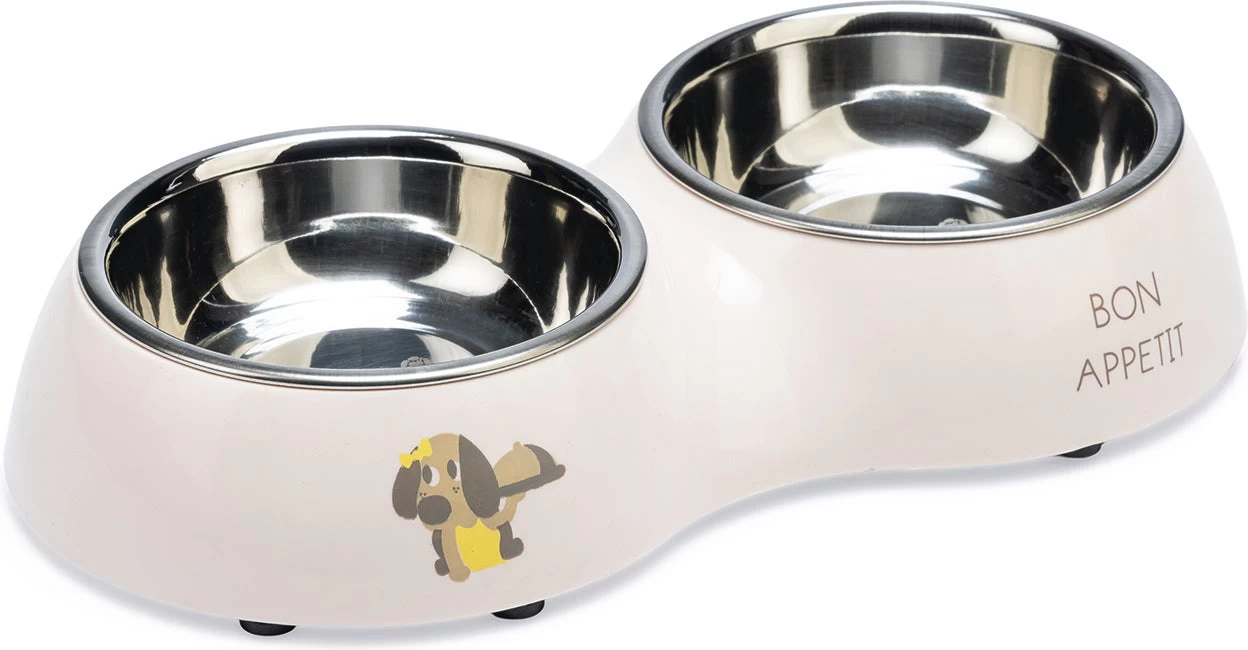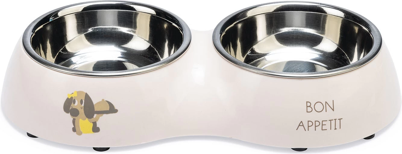 Met de Beeztees Dinerset Binky kan je jouw pup, geheel in stijl, voorzien van heerlijk voer en water. Deze hondenvoerbak en drinkbak voor jouw pup is gemaakt van plastic en bevat 2 uitneembare RVS bakjes. Zo hoef je alleen de RVS bakjes te pakken om jouw pup te kunnen voorzien van voer of water. Het RVS zorgt ervoor dat de geur van eten niet geabsorbeerd wordt, tevens zijn deze geschikt voor reiniging in de vaatwasser. Om verschuiven en krassen op jouw vloer te voorkomen, beschikt de plastic bak over anti-slip dopjes aan de onderzijde. Zoals de afbeelding op de bak al zegt: Bon Appetit! – Gemaakt van plastic en RVS – RVS bakjes geschikt voor reiniging in de vaatwasser – Inclusief anti-slip dopjes – Verkrijgbaar in 2 verschillende maten Afmetingen: – 27x14x4,5 cm – 2x 160 ml – 34×17,5×6 cm – 2x 350 ml