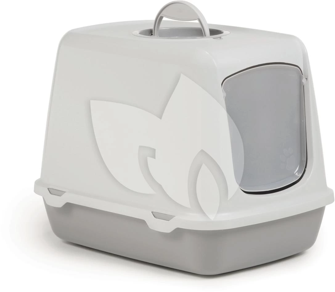 Een solide kattentoilet genaamd Oscar. Dit toilet is voorzien van een deurtje, filter en handvat. Kleur onderbak: donkergrijs, kleur bovenkap: wit.