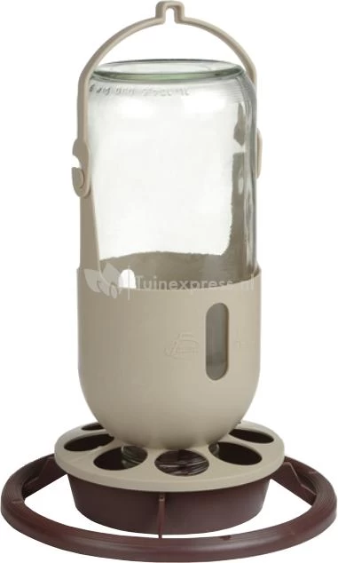 Een pothouder met glazen pot voor voer of water. Eenvoudig te vullen. De fles kunt u ophangen of gewoon neerzetten. Voor bijvoorbeeld in volieres. De gaatjes in het onderste gedeelte kunt u gebruiken om een verwarmer in te steken, zodat het water niet bevriest .