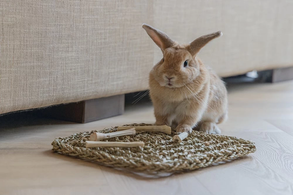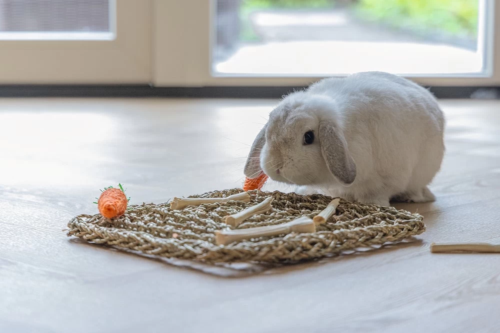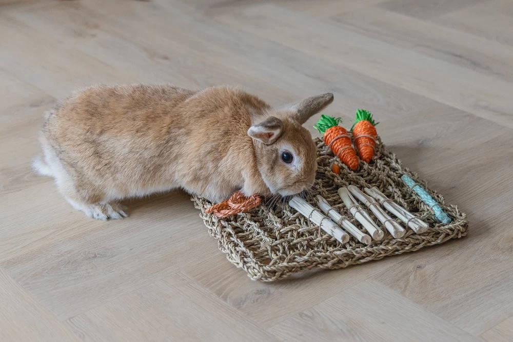 Met deze Nature Knaagdier Speelmat kan je jouw knaagdier of konijn voorzien in al zijn of haar speelbehoefte. Deze speelmat is gemaakt van natuurlijk materiaal. Hierdoor kan het geen kwaad wanneer jouw dier zijn tanden in het materiaal zet. Wat deze mat zo leuk maakt, is dat deze beschikt over diverse speelelementen. Deze diverse items kan je zowel vast laten aan de mat maar je kan ze ook loshalen. Zo kan je bijvoorbeeld iedere keer een ander speeltje vastmaken aan de mat. Door deze variatie blijft het speelgoed interessant voor jouw dier. De speelmat beschikt over een geweven mat gemaakt van zeegras, 2 rattan balletjes, 1 opgerold zeegras touw, 2 sisal touwtjes, 5 bamboe stokjes en 2 wortels gemaakt van maisbladeren.